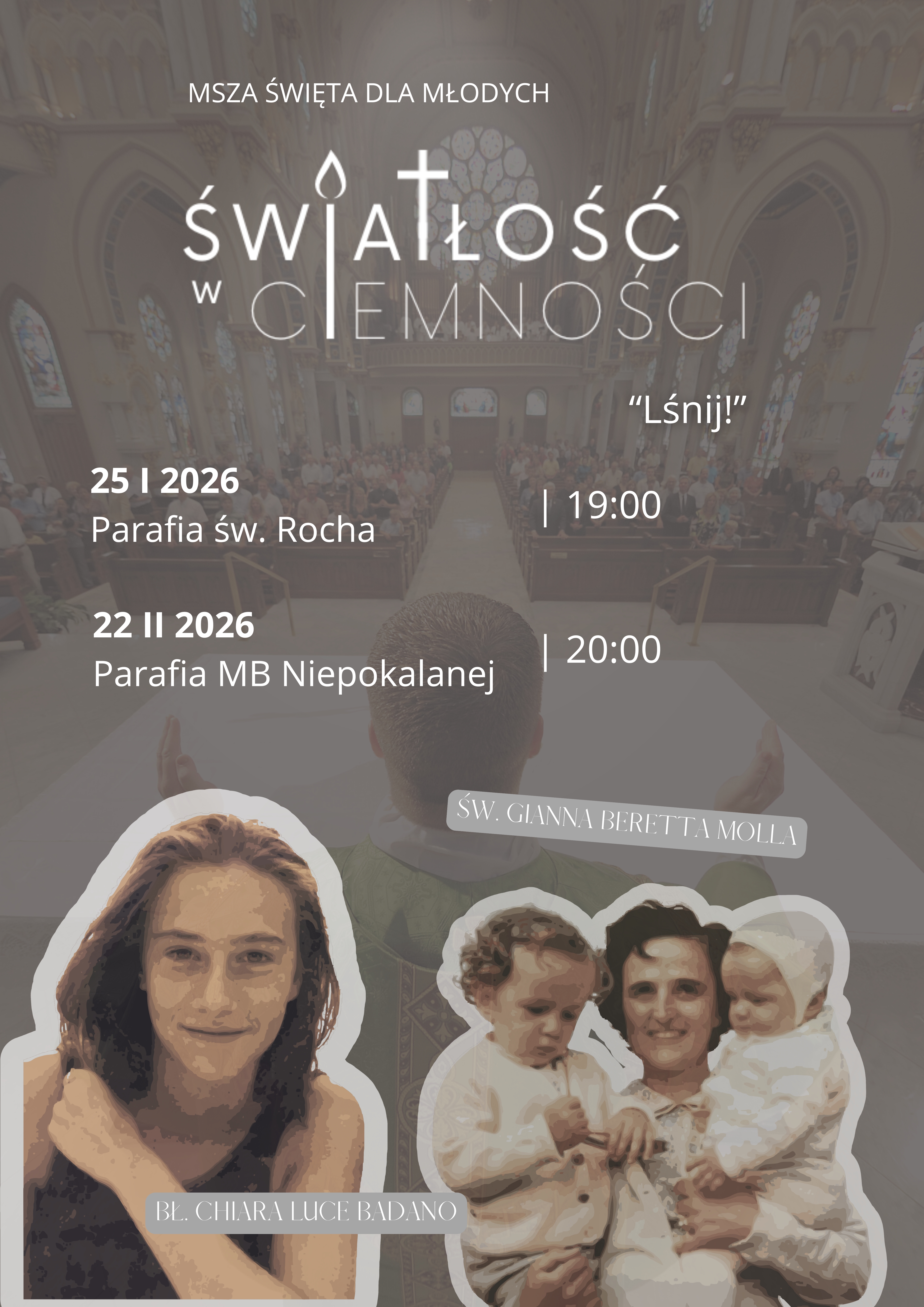 W niedzielę 25 stycznia, zapraszamy młodzież oraz wszystkich chętnych na kolejną Mszę Świętą z cyklu „Światłość w Ciemności” pod hasłem „Lśnij”.